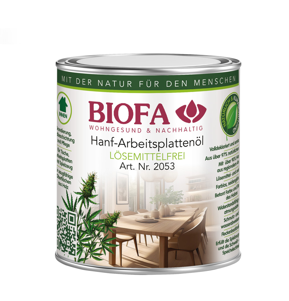 BIOFA Arbeitsplattenöl ist eine Grundierung, Endbeschichtung und Pflege für Tische, Arbeitsplatten und Spielzeug.